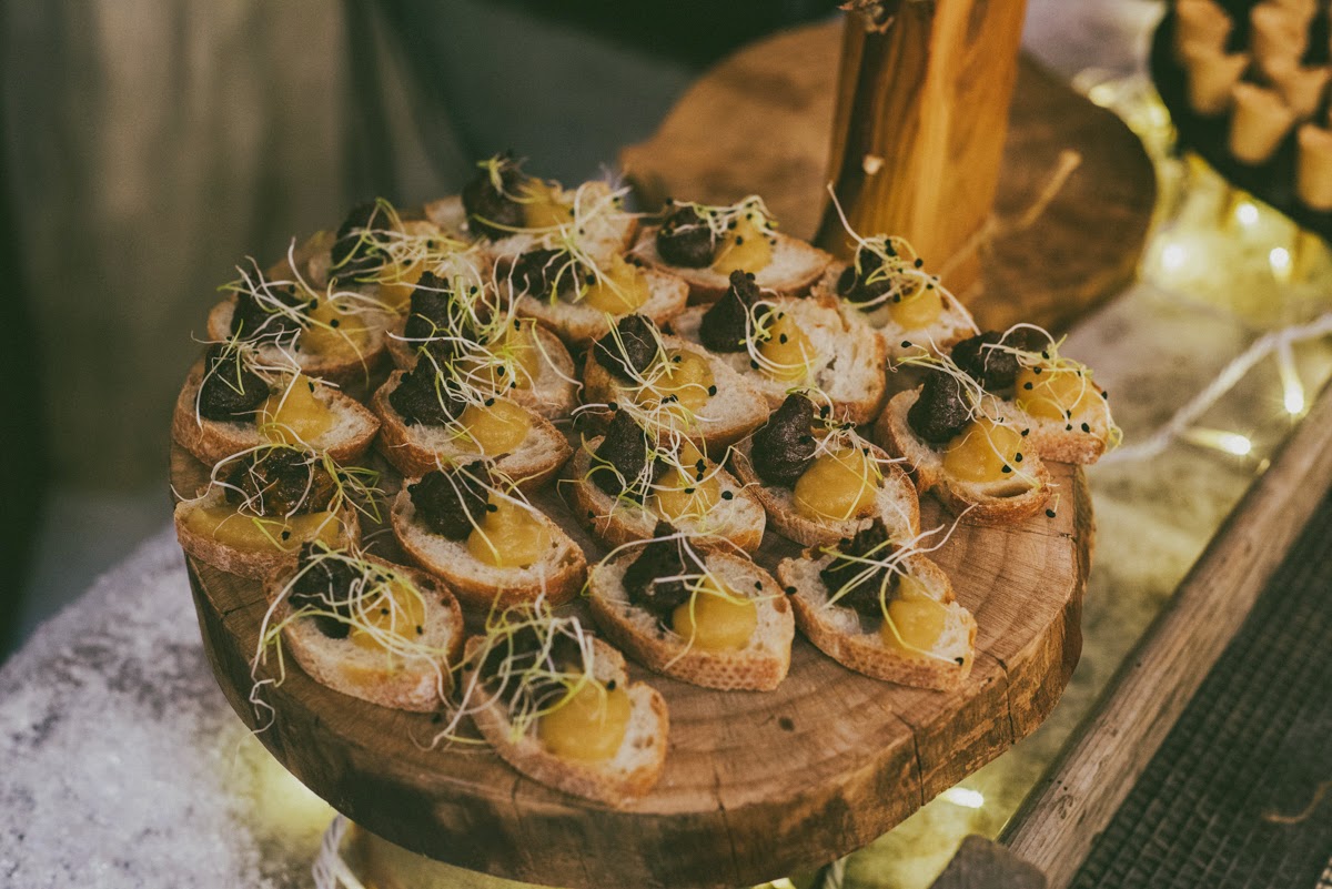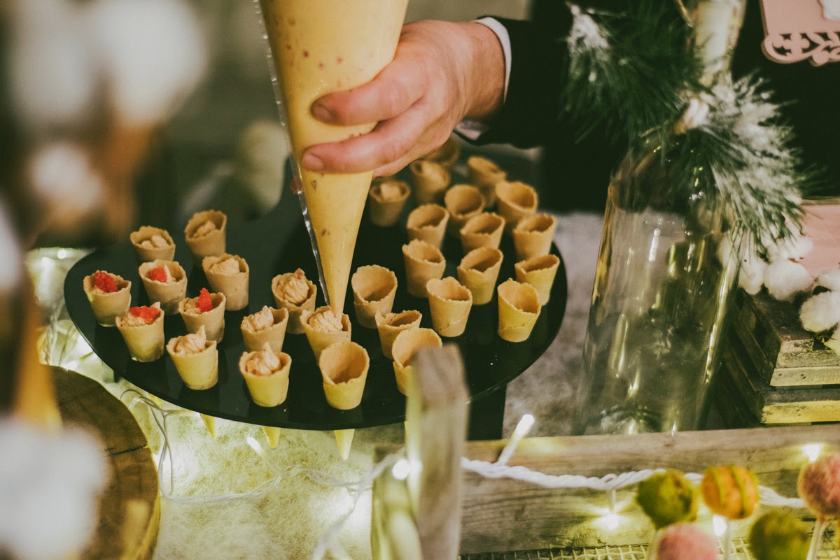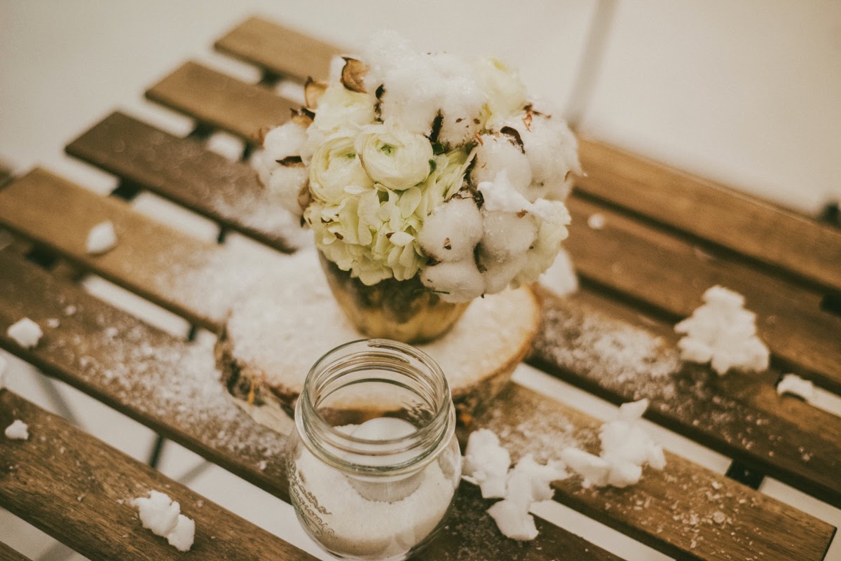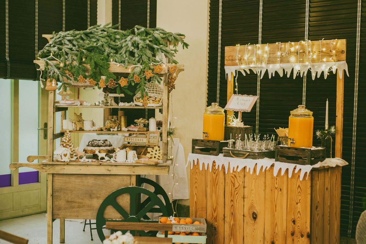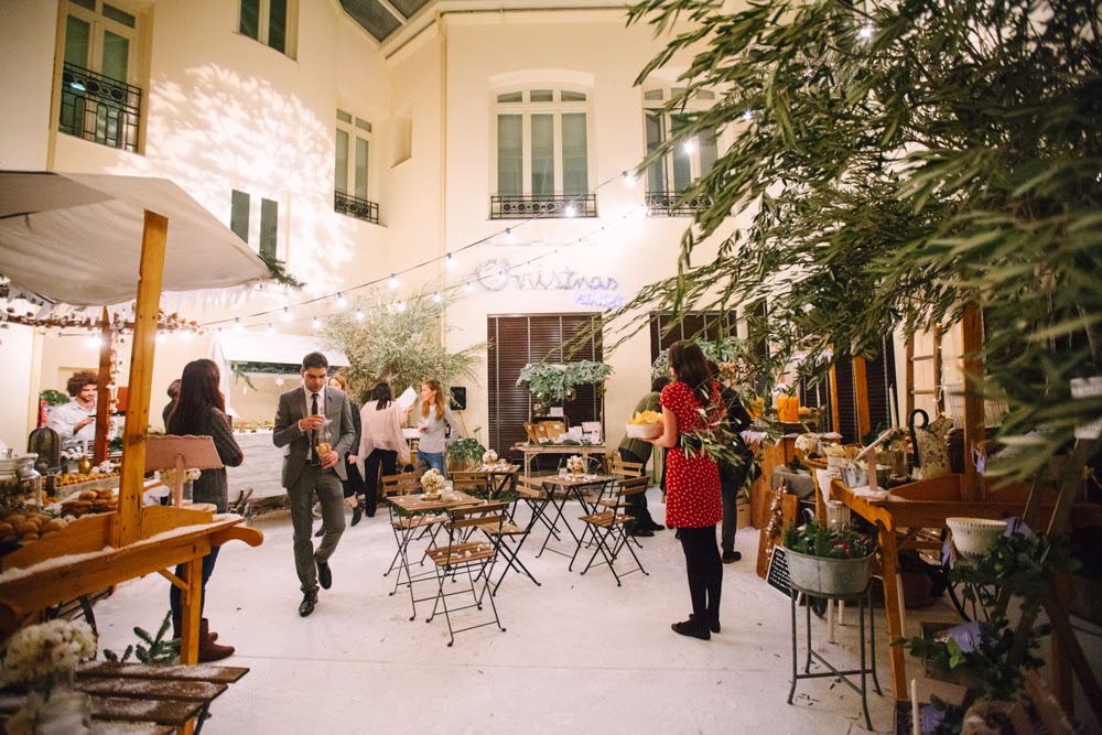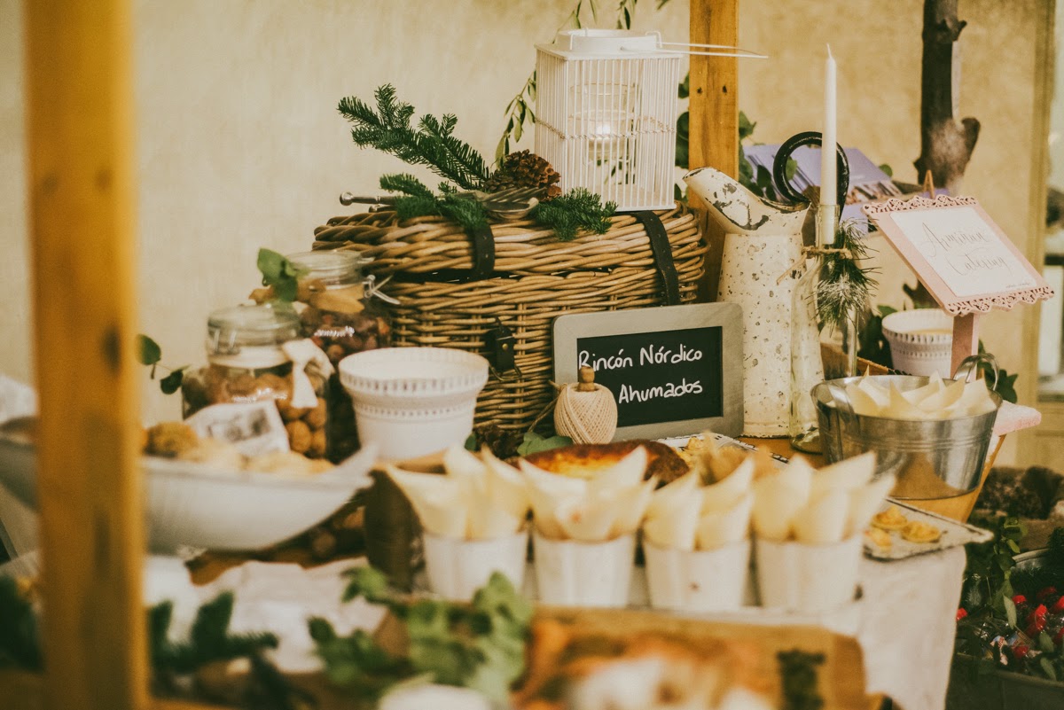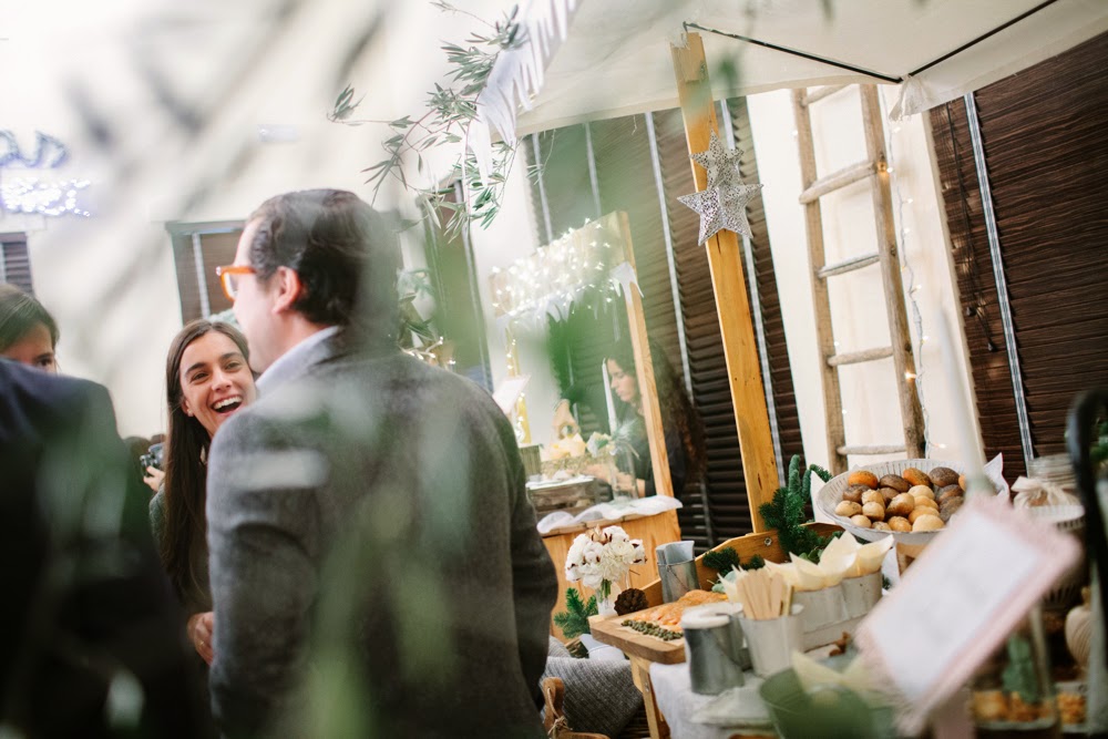 Cuando entré me pareció estar en un cuento de Navidad de Dickens. Una fachada de ladrillo blanco me dio la bienvenida nada más entrar. El suelo cubierto por una alfombra blanca cubierta con un plástico te hacía creer que andabas sobre nieve. Debajo de la cúpula del hotel me rodeaban puestecitos de madera llenos de comida y bebida. Hojarasca, ramas, leña, piñas, coronas, una estrella de ramas, un árbol de Navidad… eran algunos de los detalles que adornaban el espacio. Me encontré en una auténtica boda de invierno.