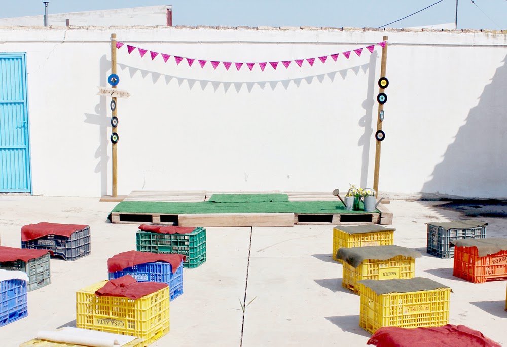 Para hacer esto, lo primero que hicimos fue convertir la localización, (un precioso patio de la casa de los propios JU&SU) en un teatro festivalero con su patio de butacas y escenario incluido.