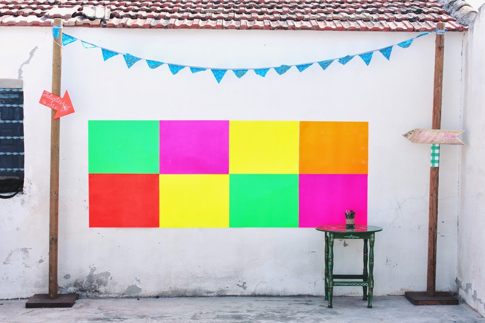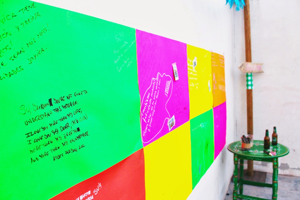 No podía faltar el photocall, para que los asistentes pudieran inmortalizar el momento a la vez que escribían sus mejores deseos para la cumpleañera en el libro de firmas, que en este caso era el propio photocall. Ocho paneles de colores presididos por una mesa retro preciosa con “Poscas” para escribir y washitape para pegar las polaroids que luego se llevaría la homenajeada de recuerdo.