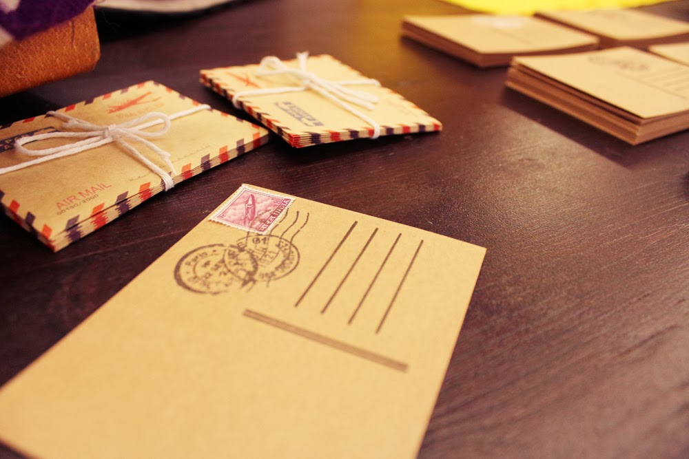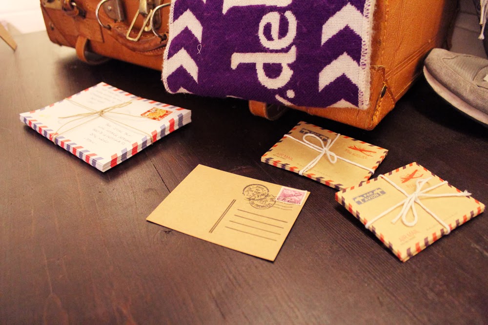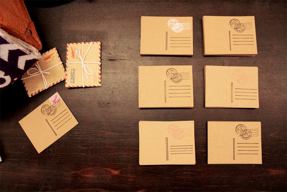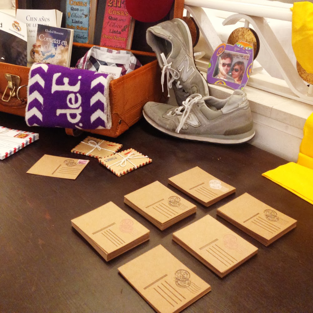 Se nos ocurrió que ya que las mesas se iban a llamar como los lugares en los que los novios habían viajado juntos, por qué no hacíamos que los invitados enviasen postales a los novios como Forrest a Jenny en la película.