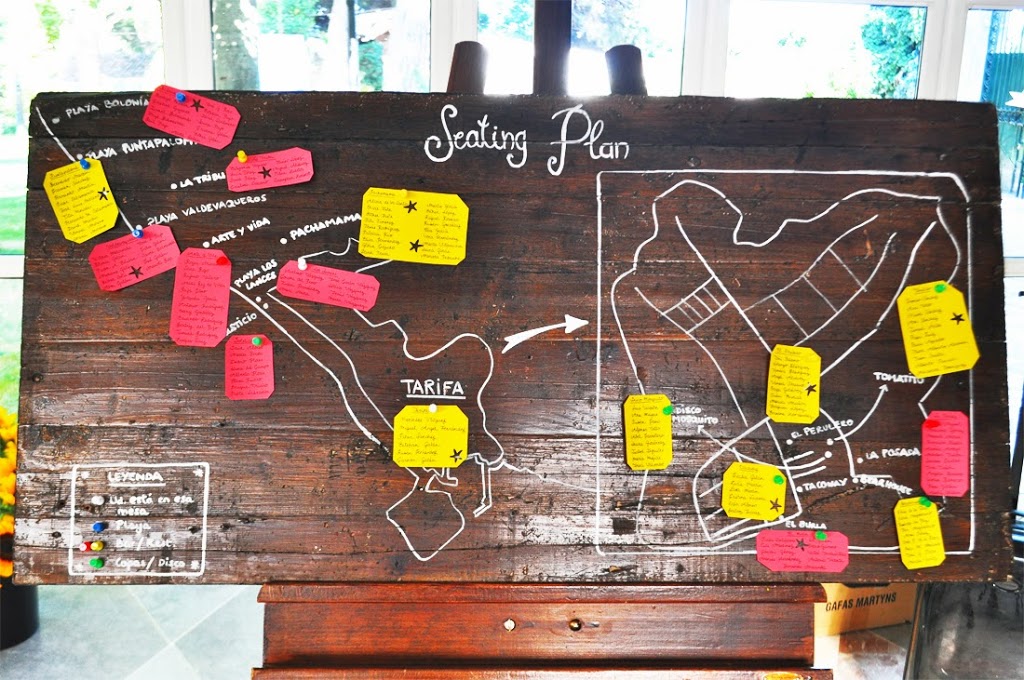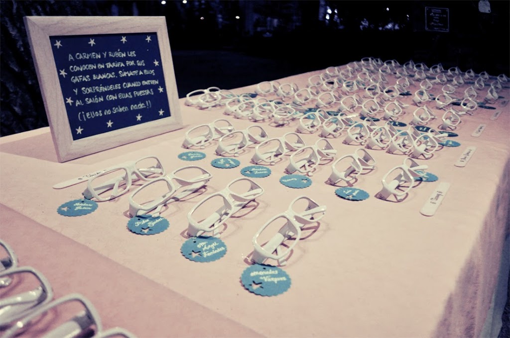 Es la distribución de los invitados por mesas que suele ponerse en la entrada del banquete para que todo el mundo sepa en qué mesa va sentado. Pueden ser un único elemento o dos, en función de lo que decidáis. Nosotras, por ejemplo, en la boda de C+R, la boda tarifeña del pasado año, decidimos optar por ambas cosas. Por un lado, llamamos protocolo a las gafas de pasta blanca que preparamos para cada invitado, con una etiqueta con su nombre y el nombre de la mesa; por el otro, pusimos un cartel de madera en el que venía representado un mapa de Tarifa y localizados en él los nombres de playas y locales que fueron escogidos por los novios para nombrar a sus mesas.