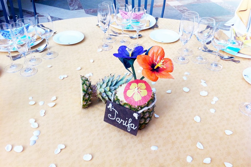 Los distintivos que permiten reconocer a las mesas o, dicho en cristiano, los nombres de la mesa. En esta boda en concreto eran nombres de locales y playas de Tarifa, el lugar en el que veranean los novios… En este caso, además, el mesero iba unido a un centro de mesa muy especial…