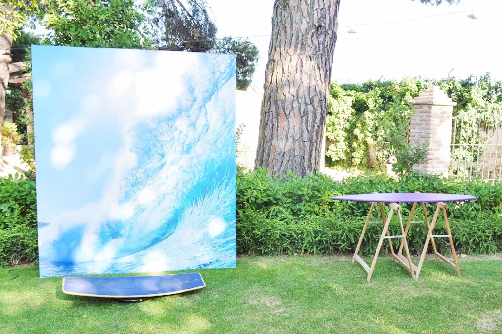 Algunos fotógrafos te dirán que es lo mismo; otros tantos que no es igual. A veces utilizamos los dos términos de forma indistinta, aunque en realidad los más puristas te dirán que el photocall es el lienzo que se coloca detrás de los invitados para hacerse fotos a su llegada (como los clásicos photocalls de la «red carpet» de los famosos) y el photobooth la cortina negra con elementos para disfrazarse que preparan los fotógrafos para el momento baile. Lo que realizamos nosotras en el fondo es una mezcla de ambas cosas, así que a nuestro producto sí le llamamos photocall… En la boda tarifeña, una gran ola con una tabla de surf para entonar todos el Surfin’USA